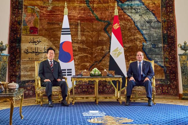 이집트를 공식 방문 중인 이재명 대통령이 20일(현지시간) 카이로 대통령궁에서 압델 파타 알시시 대통령과 한·이집트 단독 정상회담을 하고 있다.