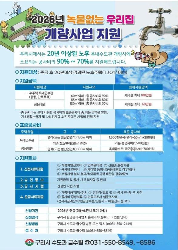 구리시(시장 백경현)는 2026년 수도관 개량 공사비 지원 사업의 신청을 오는 2월 2일부터 접수한다고 밝혔다.
