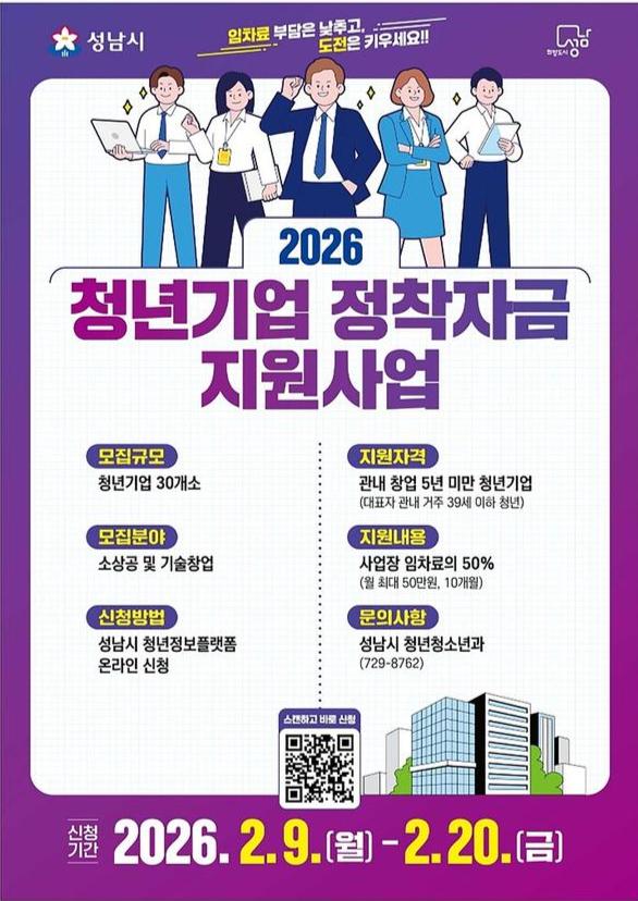 성남시(시장 신상진)는 청년 창업기업의 안정적인 정착을 돕기 위해 사업장 임차료의 50%를 지원한다고 9일 밝혔다.