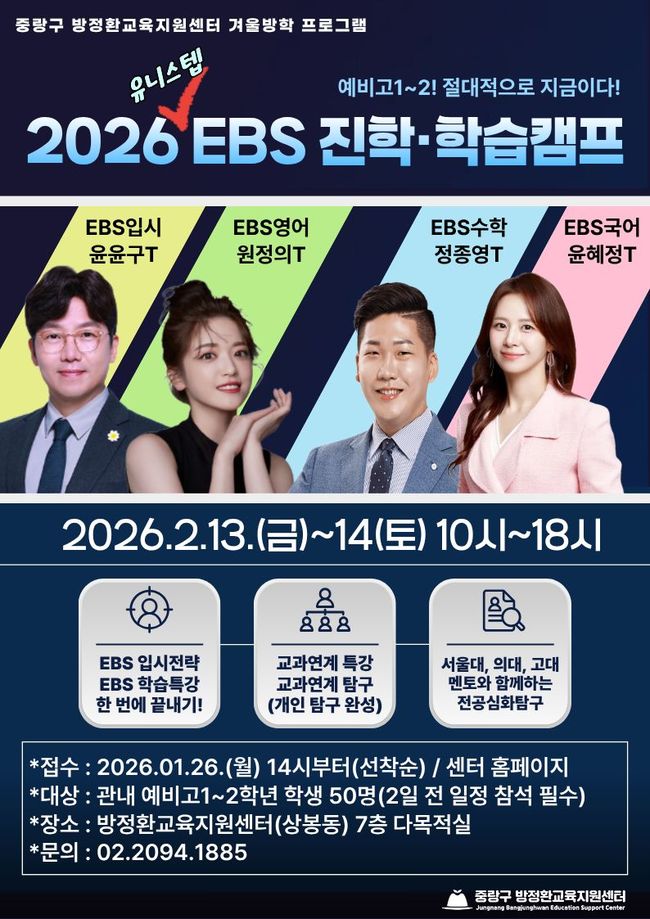 중랑구 방정환교육지원센터, 겨울방학 맞아 '2026 EBS 진학·학습캠프' 운영.중랑구 방정환교육지원센터는 겨울방학을 맞아 관내 예비 고등학교 1~2학년을 대상으로 ‘2026 EBS 진학·학습 캠프’를 진행한다고 11일 밝혔다. 캠프는 오는 2월 13일부터 14일까지 이틀간 오전 10시부터 오후 6시까지 중랑구 망우로 325에 위치한 방정환교육지원센터에서 열린다.