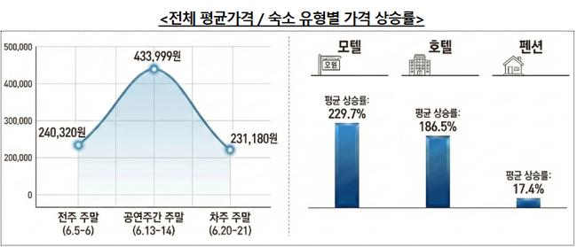 공정거래위원회는 한국소비자원과 함께 부산지역 호텔·모텔·펜션 135곳을 대상으로 6월 공연 기간(6월 13~14일) 숙박요금을 조사한 결과, 해당 주말 1박 평균 요금이 전주(6월 6~7일) 및 차주(6월 20~21일) 대비 2.4배(143.9%) 상승했다고 밝혔다.