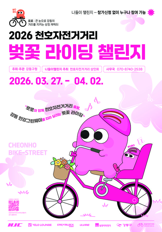 강동구(구청장 이수희)는 '2026 천호자전거거리 벚꽃 라이딩 챌린지'를 개최한다고 23일 밝혔다. 기간은 오는 27일부터 4월 2일까지 7일간이다. 천호자전거거리 상인회가 지역 상권과 연계한 나들이 코스를 마련해 봄맞이 지역 축제로 꾸며진다. 사전 신청 접수는 지난 2월 19일 시작 6시간 만에 2,500명이 몰리며 마감됐다.
