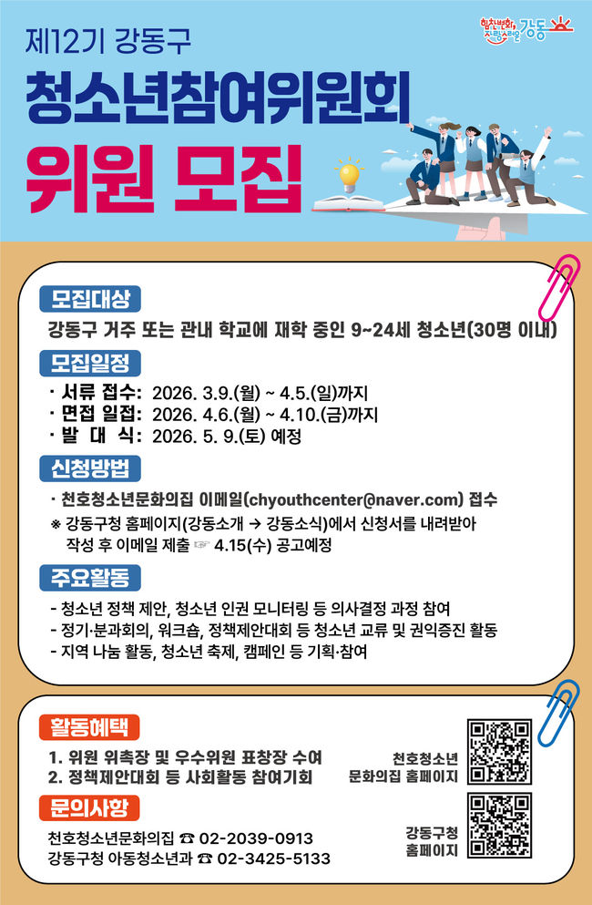 서울 강동구가 청소년 정책 참여 기구인 제12기 청소년참여위원회 신규 위원 모집에 나선다.