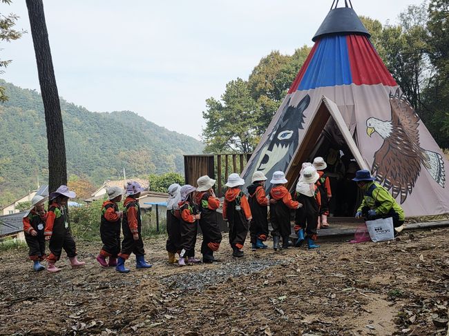 산림청 국립자연휴양림관리소는 충북 청주시에 위치한 국립상당산성자연휴양림 유아숲체험원을 새롭게 단장하고 오는 4월부터 정상 운영에 들어간다고 27일 밝혔다. 아이들이 인디언 움막에 들어가고 있다.
