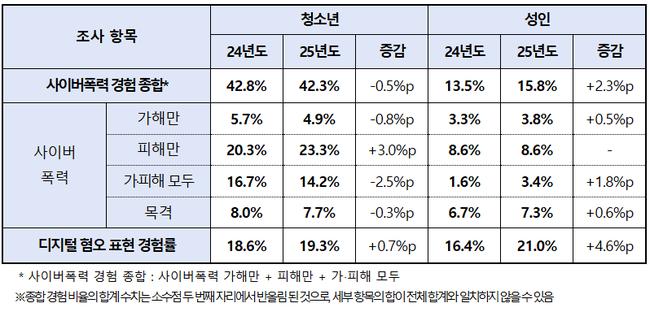 유형별로는 ‘사이버 언어폭력’이 가장 큰 비중을 차지했다. 특히 성인의 경우 언어폭력 가해와 피해 경험이 모두 증가한 것으로 나타났다. 피해 대상은 ‘전혀 모르는 사람’이 가장 많았고, 온라인에서 알게 된 사람에 의한 피해도 증가해 익명성과 비대면 관계가 주요 위험 요인으로 지목됐다.