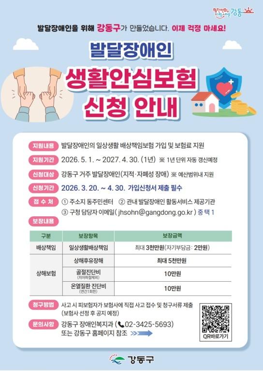발달장애인 생활안심보험 신청 안내 포스터.강동구(구청장 이수희)는 「장애인복지법」에 따라 등록된 발달장애인(지적·자폐성 장애인)을 대상으로 '생활안심보험'을 지원한다고 6일 밝혔다. 발달장애인은 일상생활에서 예측하기 어려운 돌발 행동 등으로 사고가 발생할 수 있으나, 개인적으로 보험에 가입하기 어려운 현실을 반영해 구가 직접 나선 것이다.