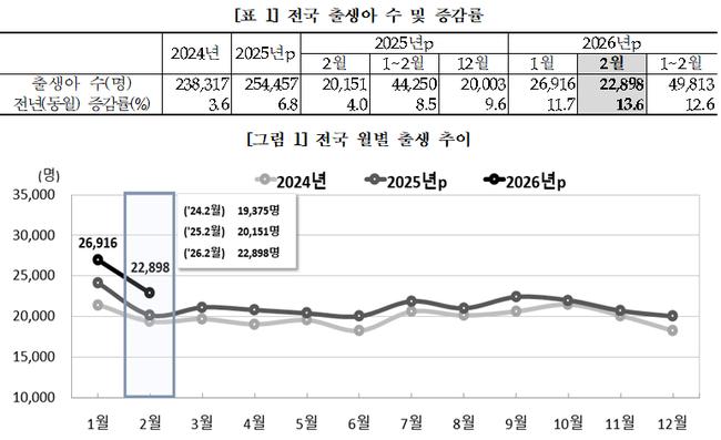 통계청이 발표한 ‘2026년 2월 인구동향’에 따르면 이 달 출생아 수는 2만2,898명으로 전년 동월 대비 13.6% 증가했으나, 사망자 수는 2만9,172명으로 출생보다 많아 자연증가가 -6,275명을 기록했다.