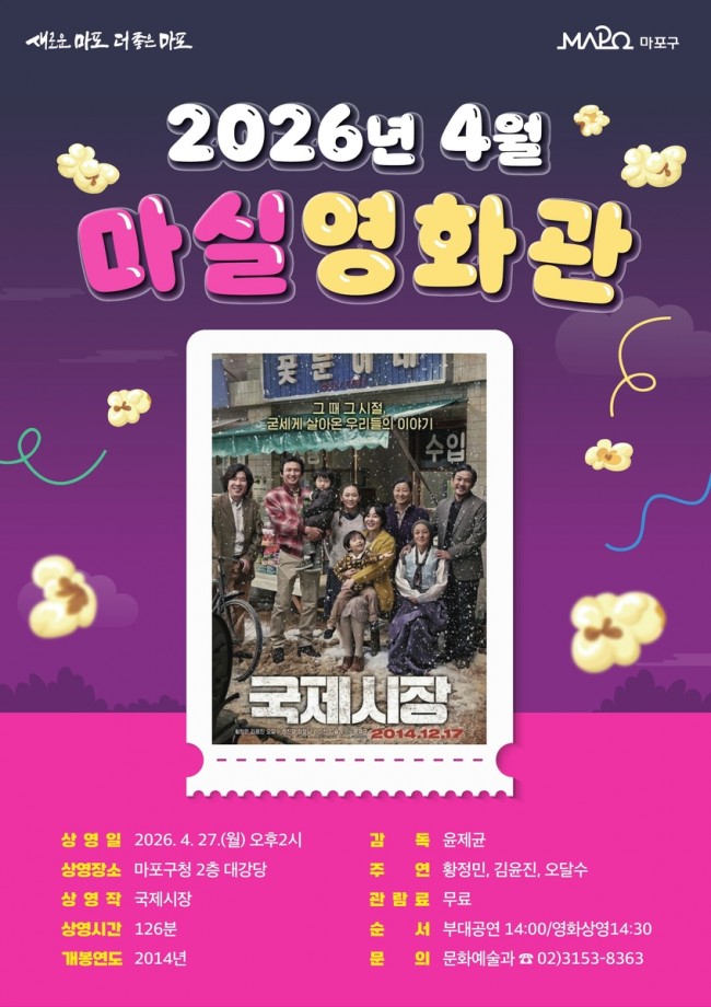 오는 4월 27일(월) 오후 2시에는 마포구청 대강당에서 1,000만 관객수를 돌파한 영화 '국제시장'이 상영될 예정이다.