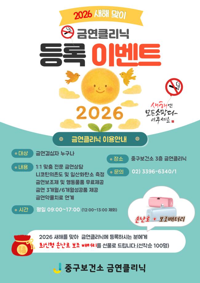 중구 새해맞이 '금연클리닉 등록 이벤트' 홍보 포스터.12일 서울 중구는 지난해 중구보건소 금연클리닉에 참여한 흡연자 가운데 38.4%가 6개월 이상 금연에 성공했다고 밝혔다. 이는 자치구 금연클리닉 평균 성공률 31.1%보다 7.3%포인트 높은 수치로, 중구의 금연 지원 프로그램이 실질적인 성과를 거두고 있다는 평가다.